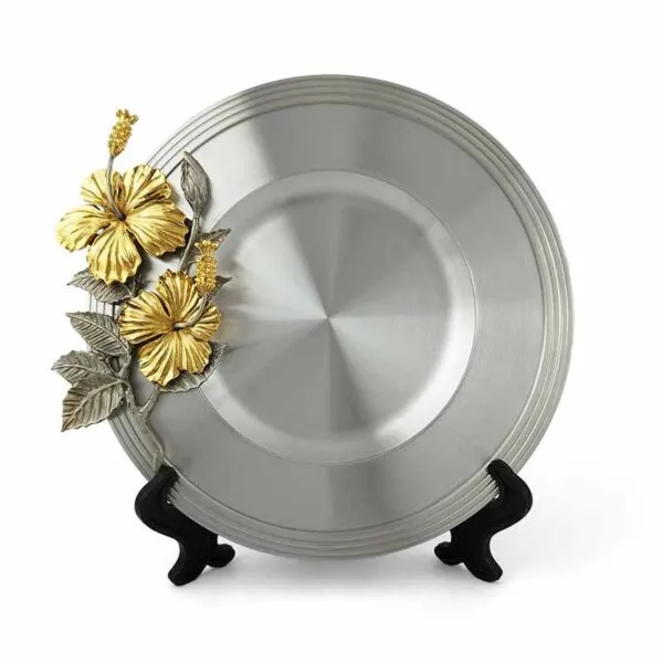 This plate is designed with gold plated pewter hibiscus